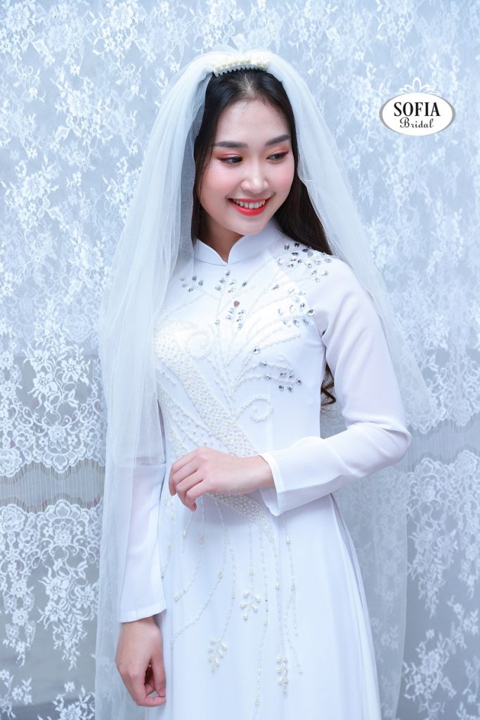 với mẫu áo dài cô dâu màu trắng cao cấp kết hợp với phụ kiện, Sự phối hợp hài hoà giúp quý cô trở nên duyên dáng, thanh lịch của người con gái Việt –